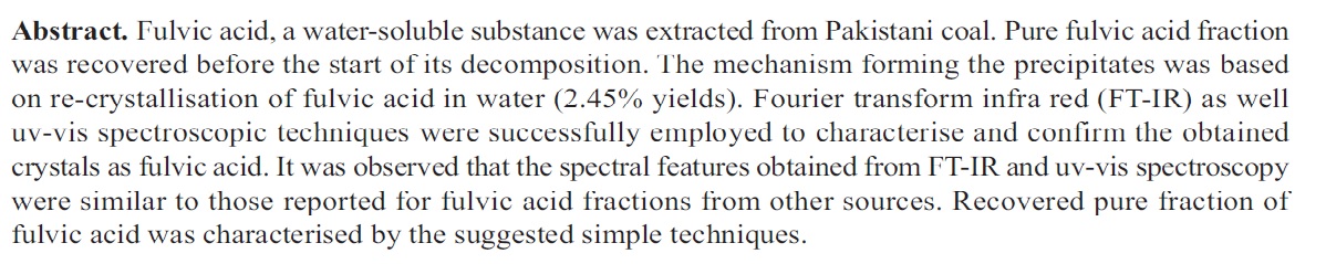 Extraction, Purification and Characterisation of Nutraceutical Grade Fulvic Acid from Lignite Coal of Lakhra-Jamshoro, Pakistan
